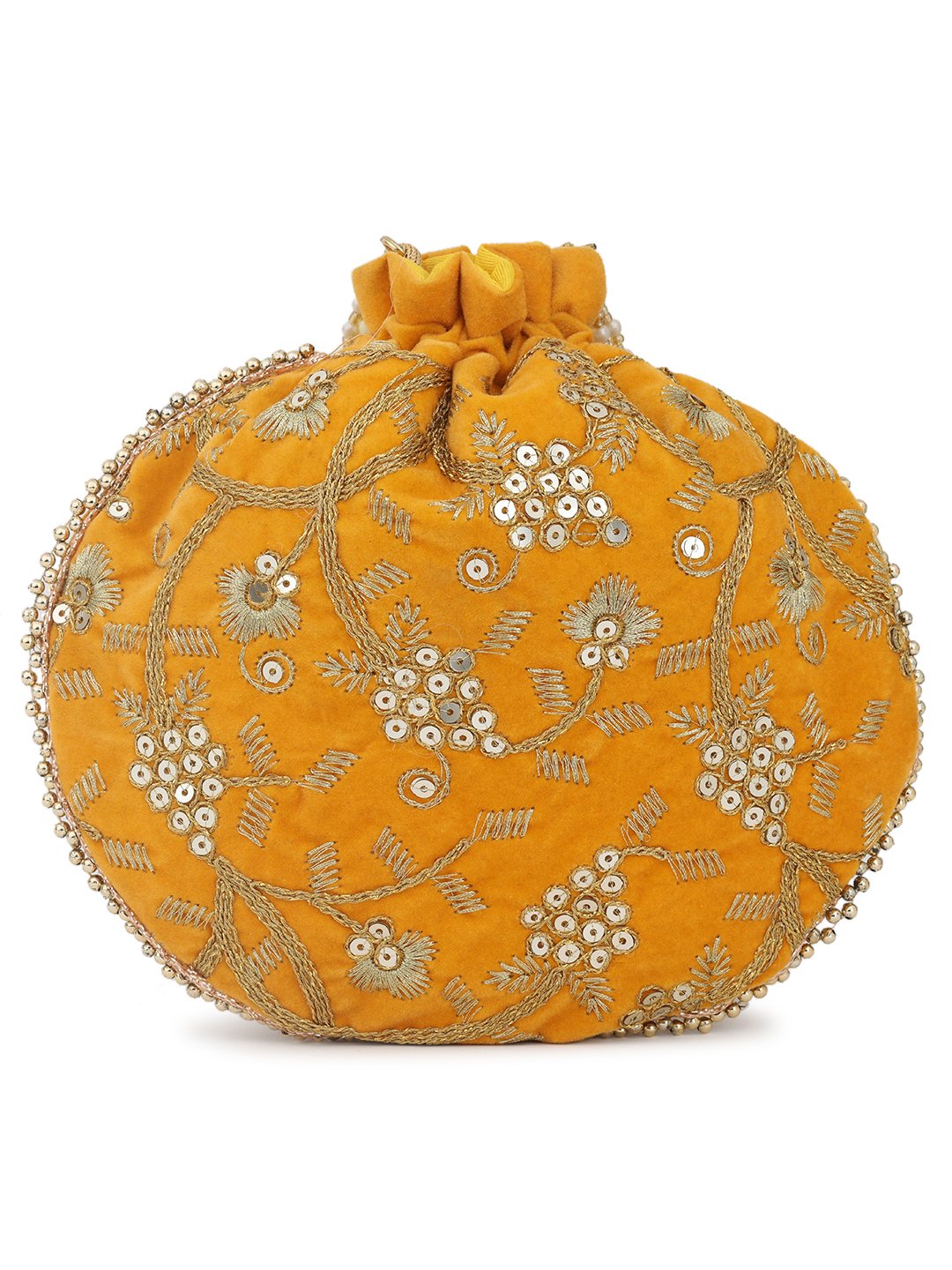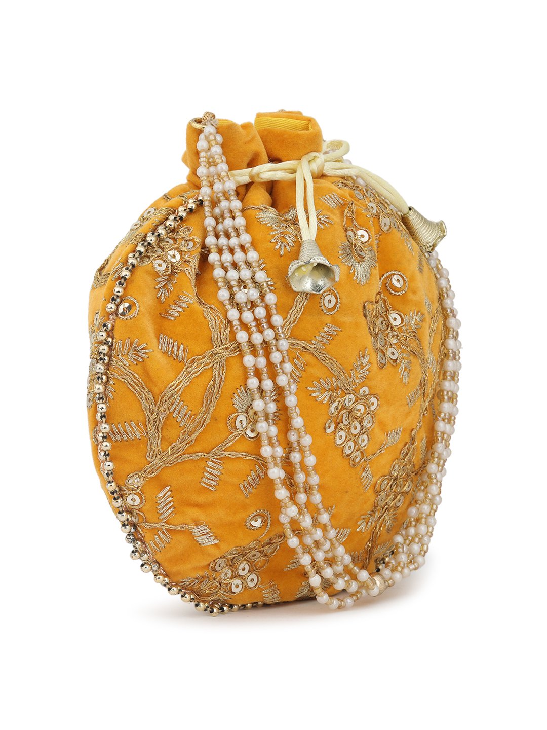 Yellow embroidered potli clutches Has wrist loop 1 main compartment with drawstring closure Size & Fit Height: 9 cm Width: