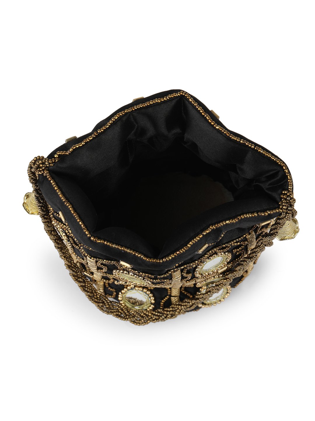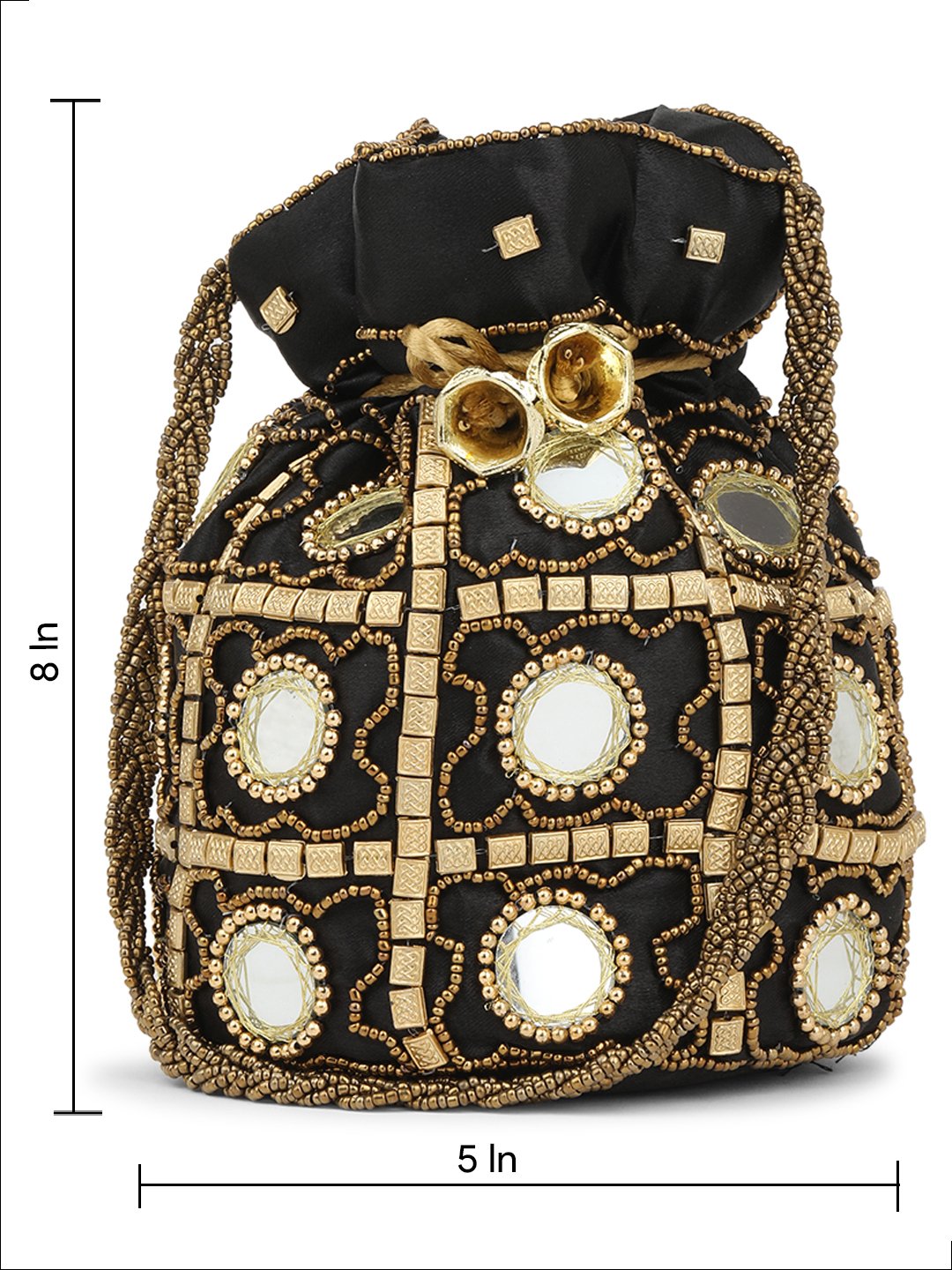 Golden embellished potli Has wrist loop 1 main compartment with drawstring closure Size & Fit Size : 9 x 9