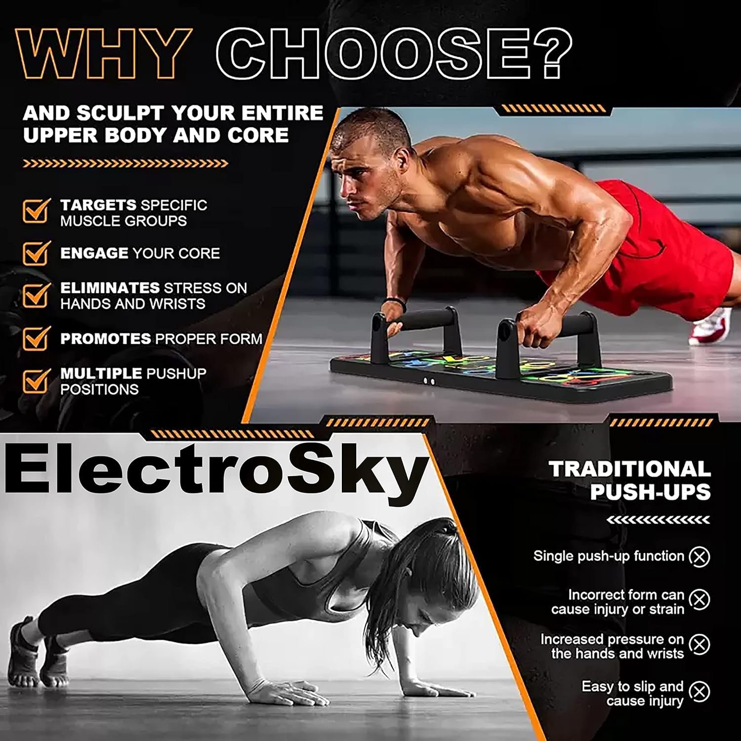 The Push-Up Board features color-coded, multiple handgrip positions that target different muscle groups, including chest, shoulders, back, and triceps. Easily switch between positions to customize your workout
