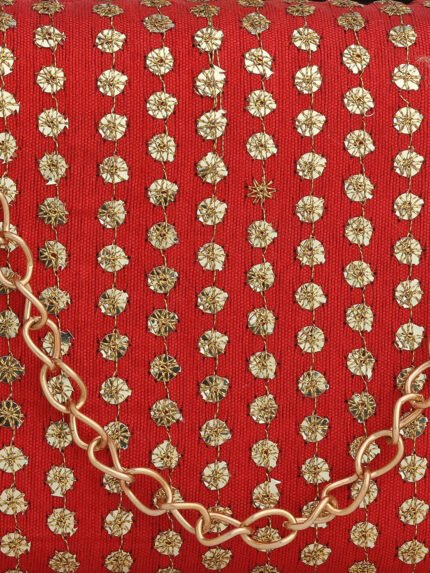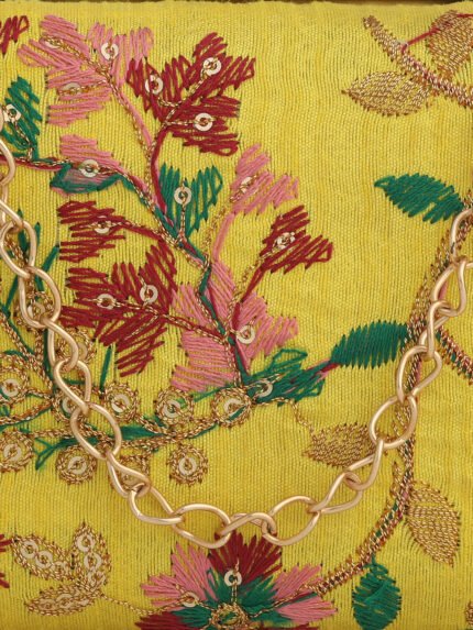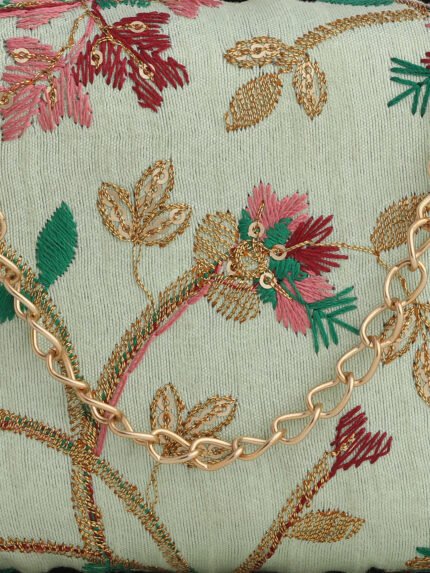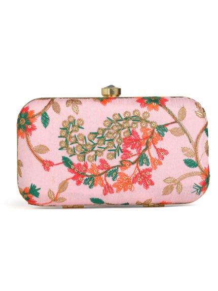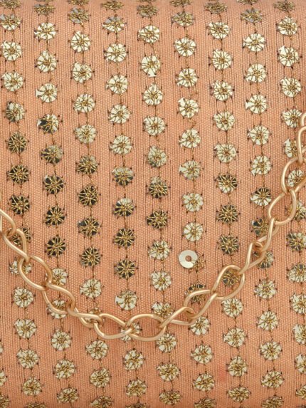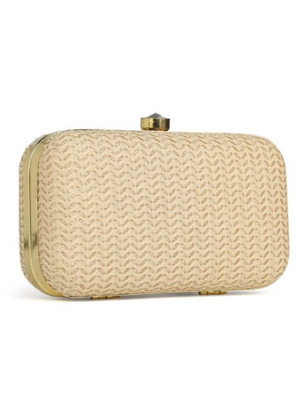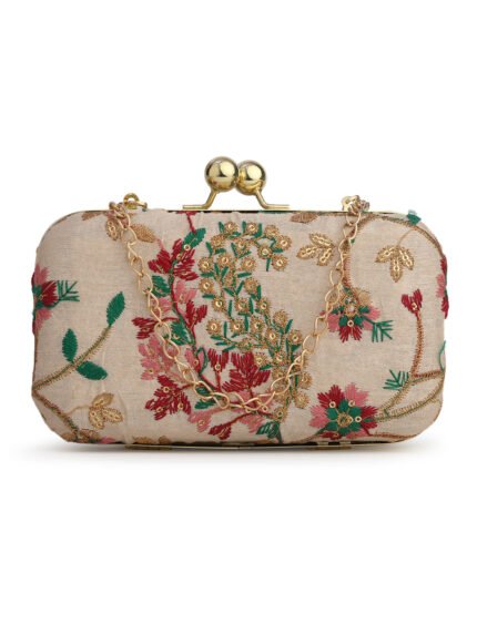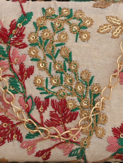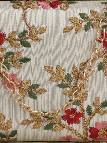 White & Gold Embroidered Clutch 1 Main compartment with click closure has detachable shoulder strap