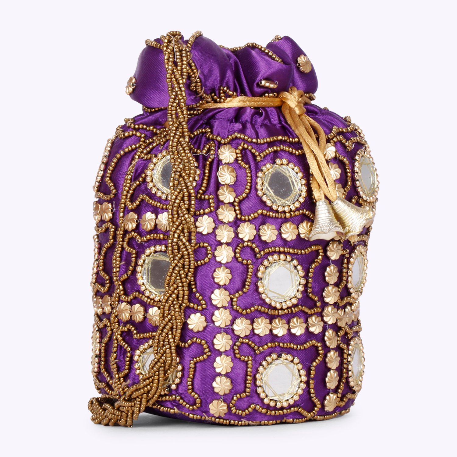 Purple and gold-toned embellished potli clutches Has wrist loop 1 main compartment with drawstring closure Size & Fit Height: 18 cm Width: 10 cm Depth: 2 cm Material & Care Fabric Wipe with clean, dry cloth