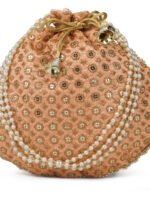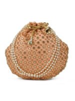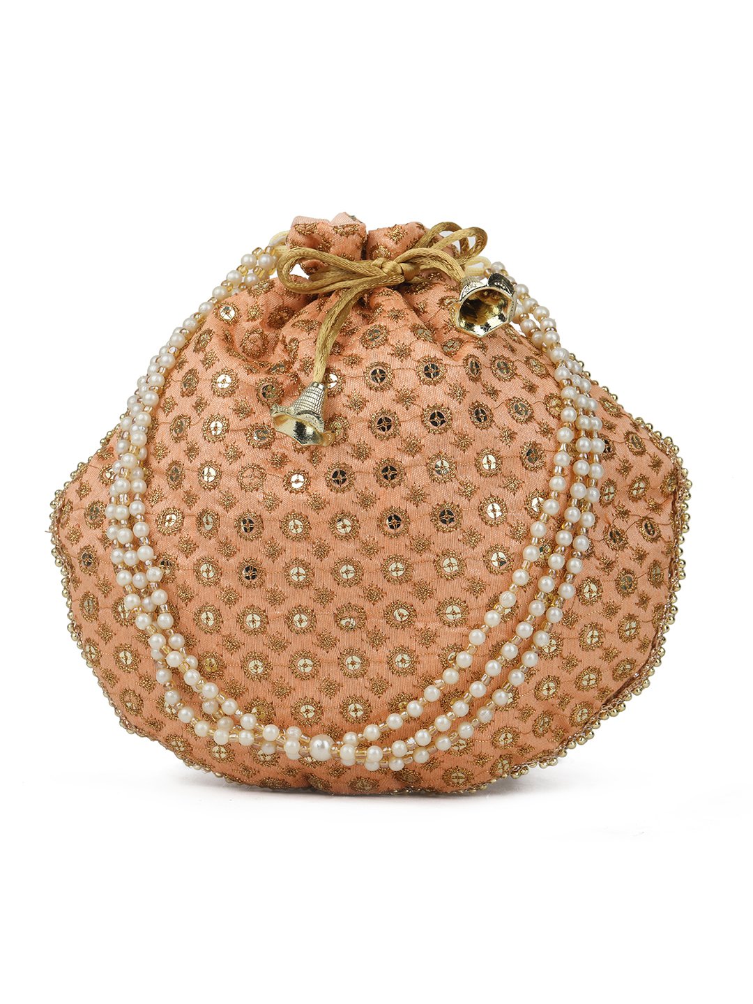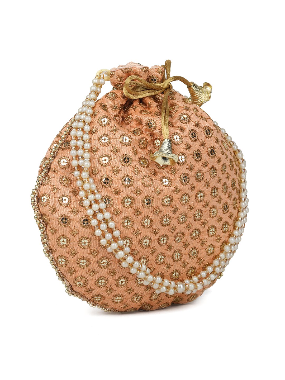 Beige embellished potli Has wrist loop 1 main compartment with drawstring closure Size & Fit Size : 9 x 9 x 3 Inch (Length x Width x Depth ) Material & Care Fabric Wipe with clean, dry cloth